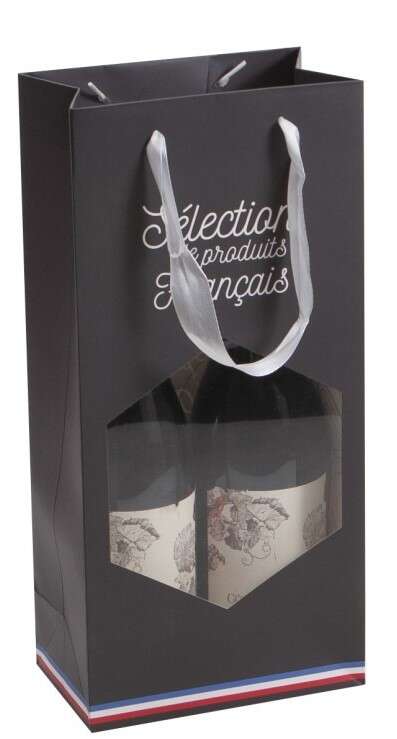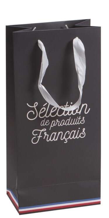 Ofrezca a sus clientes esta bolsa fabricada con cartón gris oscuro resistente y duradero. Diseñado para envolver y proteger dos botellas, su ventana de PVC transparente deja ver completamente el contenido. Su eslogan “Selección de productos franceses”, realzado por una banda tricolor, está impreso en ambas caras. Las asas de cinta blanca facilitan el transporte de botellas u otros productos locales.