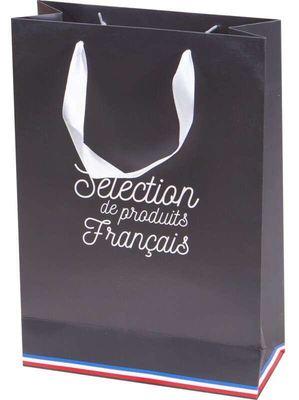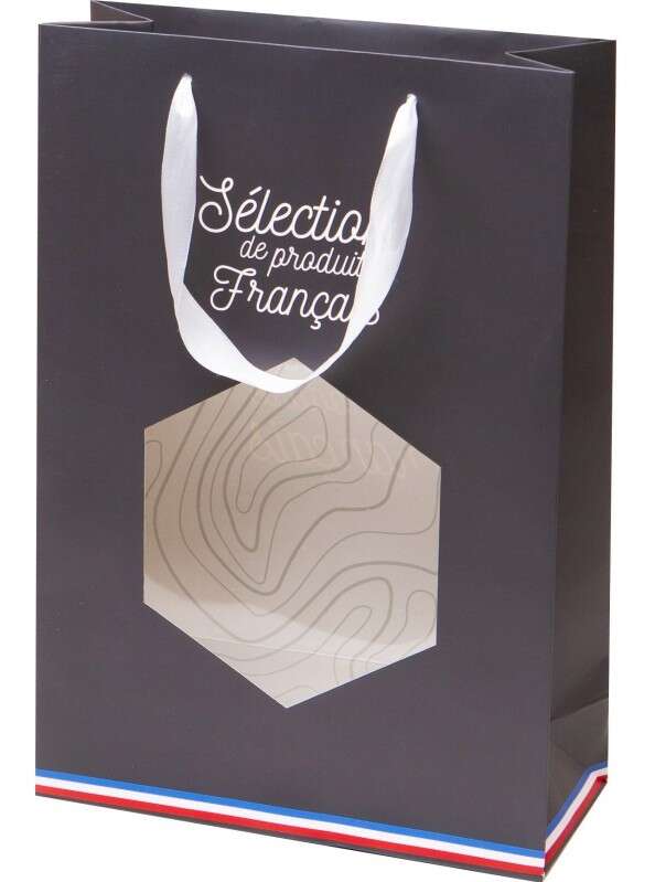 Ofrezca a sus clientes esta bolsa fabricada con cartón gris oscuro resistente y duradero. Diseñado para envolver y proteger tres botellas, su ventana de PVC transparente deja ver completamente el contenido. Su eslogan “Selección de productos franceses”, realzado por una banda tricolor, está impreso en ambas caras. Las asas de cinta blanca facilitan el transporte de botellas u otros productos locales.