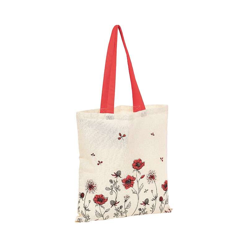 Esta bolsa de algodón con estampado floral rojo y asas resistentes es ideal para llevar tus compras con estilo.