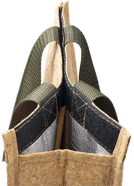 Diseñado para mantener tus botellas a la temperatura perfecta. Fabricado con un revestimiento efecto corcho, combina estética natural con gran resistencia térmica. Con asas de nailon y un cierre de velcro resistente, es práctico y duradero.